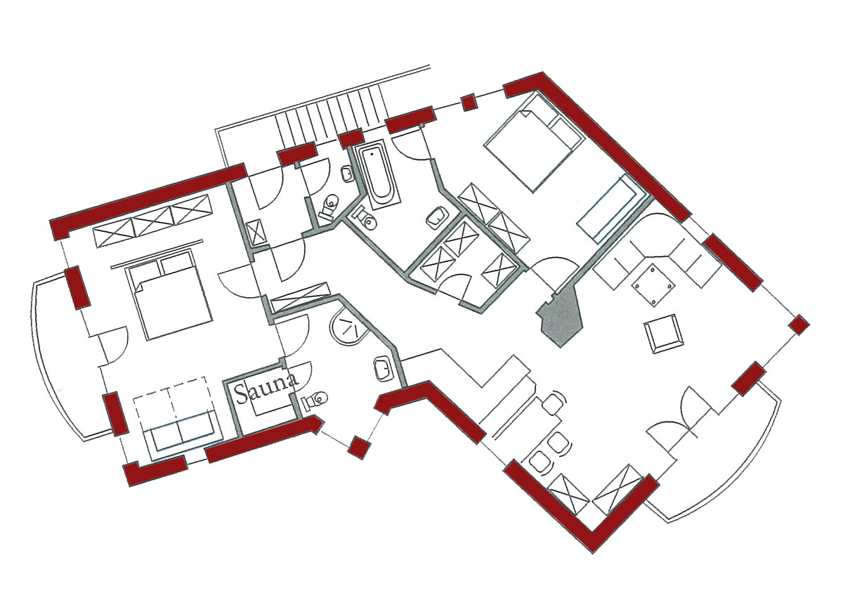 Die ca. 120m2 große Wohnung befindet sichim Dachgeschoß unseres Hauses und ver-